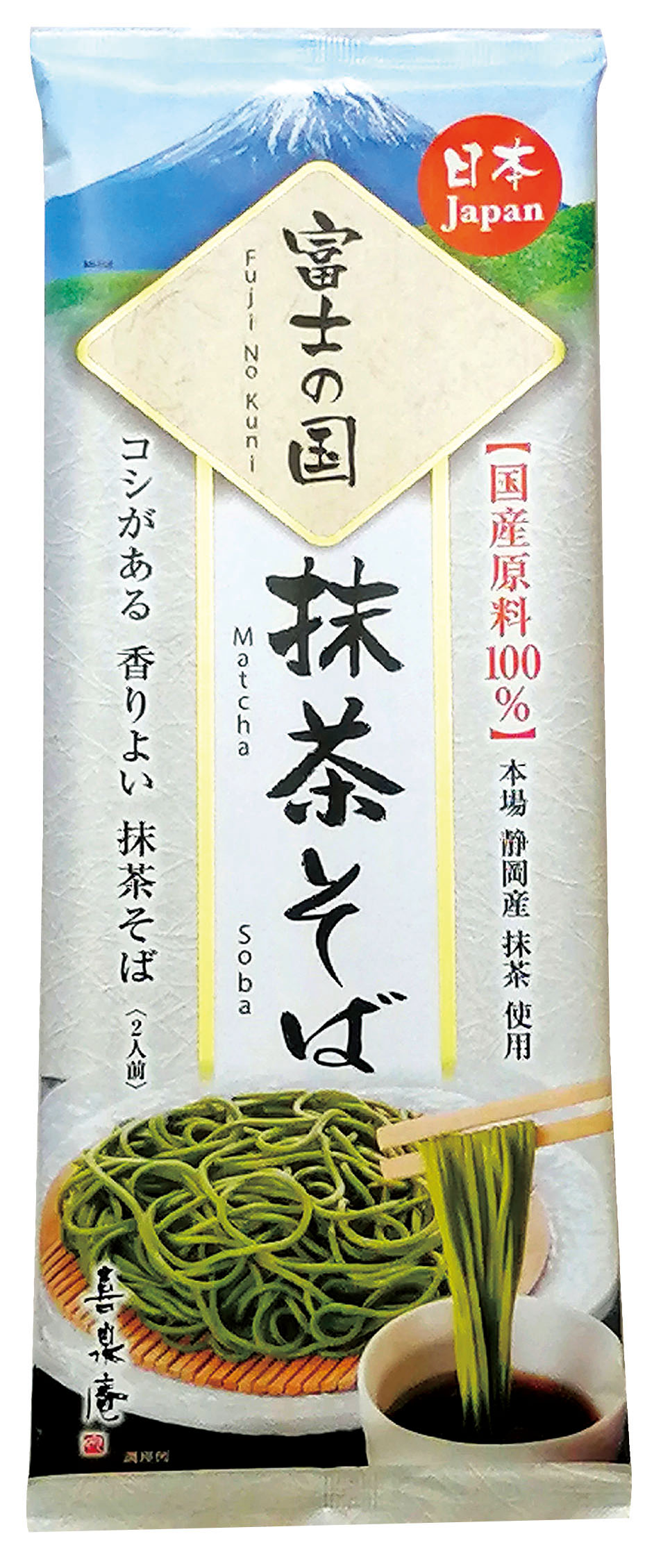 厳選された静岡県産抹茶と、天竜川の伏流水を使用し、国産小麦粉やそば粉、食塩、小麦タンパクなど、国産原料100%で作られて香り高くコシのある抹茶そばです。